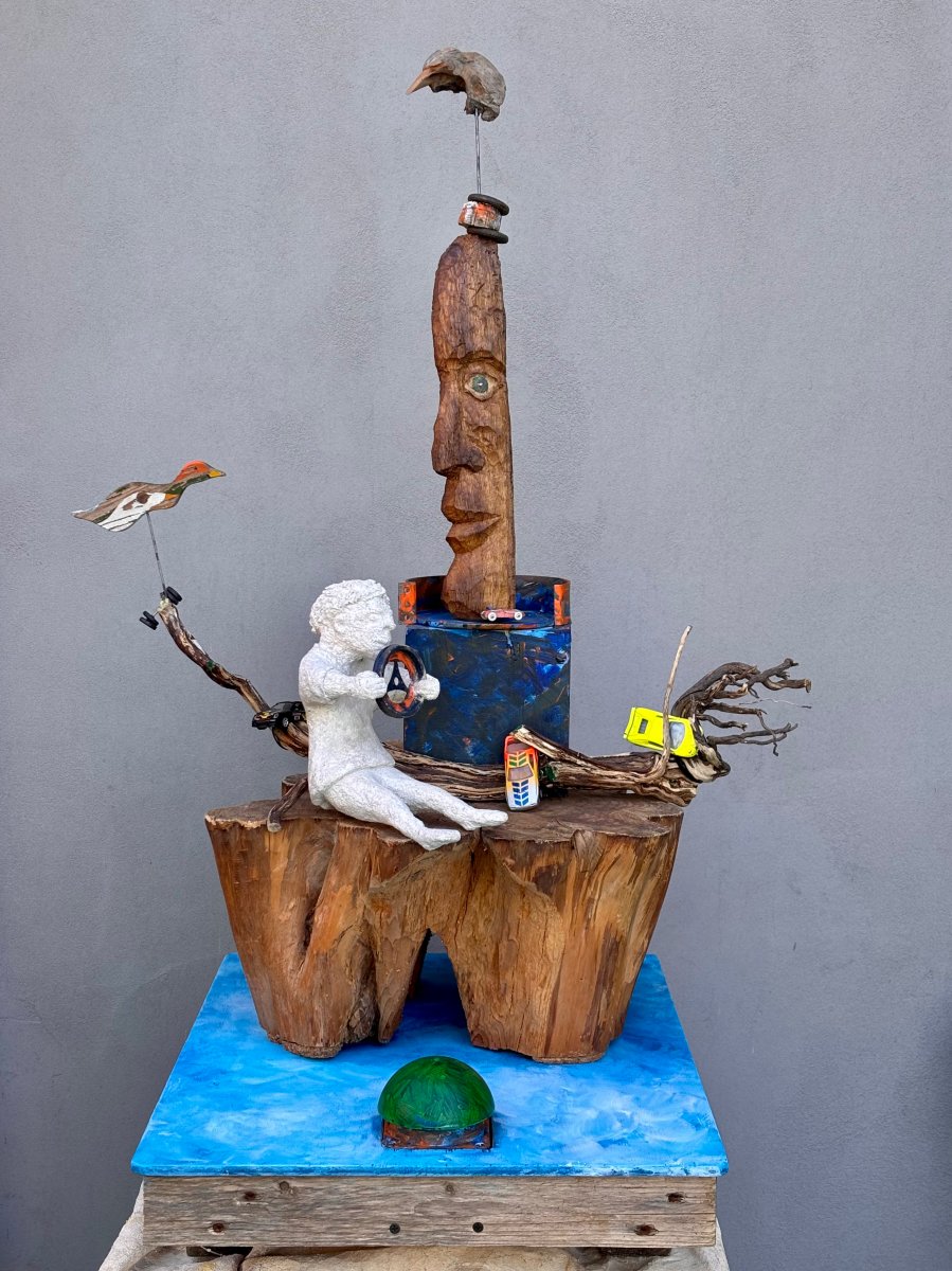 Installation : Sockel - diverse Hölzer, Skulpturen aus Eichen- und Olivenholz, Betonplastik, Spielzeug-Teile, Modell-Autos, Eisenteile, Elektromotor mit Taster, Acryl-Farbe