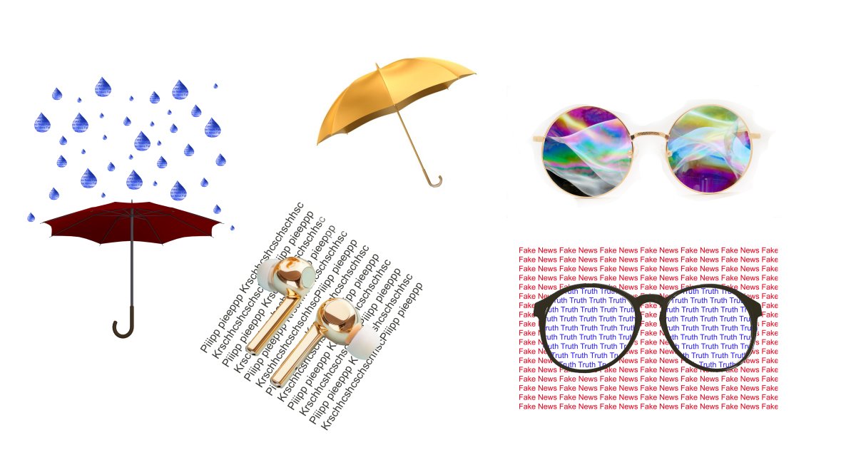 Drei goldene Alltagsobjekte – ein Schirm, eine Brille und Kopfhörer – verwandeln sich in stille Talismane gegen Desinformation. Der Schirm spannt sich schützend auf und wehrt die Flut manipulativer Nachrichten ab, wie ein Regen aus Worten. Die Brille lässt beim Lesen verborgene Ebenen sichtbar werden – Wahrheit schimmert in Blau, Lügen flackern rot. Der Kopfhörer horcht mit: Bei trügerischen Tönen rauscht es leise, ein sirrendes Warnsignal im Ohr. Gold steht hier für den Wert der Fähigkeit, zwischen Wahrheit und gezielter Täuschung zu unterscheiden. In einer Welt, in der Lügen sich als Klarheit tarnen und Hetze als freie Meinung, brauchen wir mehr als Skepsis – wir brauchen Haltung. Diese Objekte erinnern uns daran, dass Wahrheit nicht einfach da ist, sondern ertastet, entschlüsselt und behütet werden muss. Sie sind die stille Grammatik einer Sprache, die wir erst noch lernen.