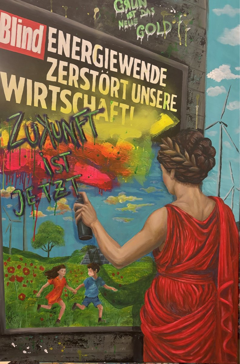 Das Gemälde konfrontiert den Betrachter mit einem kritischen Moment: Eine mythologisch anmutende Figur übermalt die populistische Schlagzeile „Energiewende zerstört unsere Wirtschaft!“ mit kraftvoller Farbe und der Botschaft „Zukunft ist jetzt“. Hinter der Fassade offenbart sich eine neue Realität – Kinder, Natur, Windräder und Solarpanels symbolisieren eine lebenswerte, nachhaltige Zukunft. Die Figur der Göttin steht dabei für Weisheit, Stärke und Wandel – sie wendet sich aktiv gegen Desinformation und Angstpropaganda. In Verbindung von klassischer Ikonografie, Street-Art-Ästhetik und zeitpolitischem Inhalt reflektiert das Werk darüber, dass die Energiewende kein Untergang, sondern eine Chance ist. Die Künstlerin wurde zu diesem Werk von den nachhaltigen Ansätzen ihres Mannes, des Künstlers Johnny Donnaray, inspiriert, mit dem sie in vielen Projekten als künstlerisches Duo arbeitet.