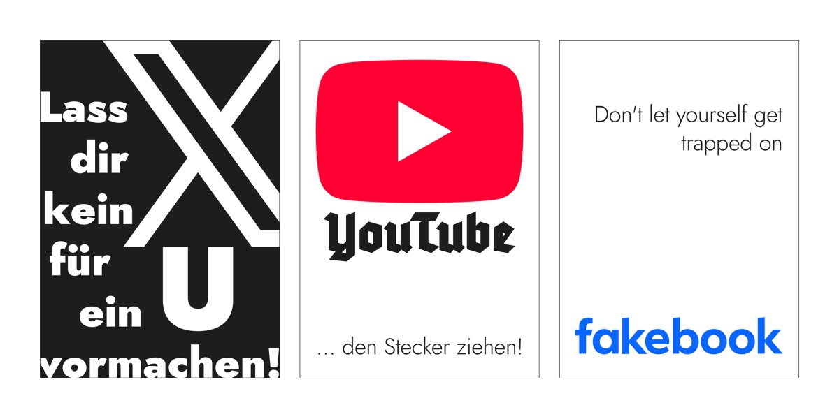 Die hier vorgestellten Arbeiten sind Teil einer aktuell im Entstehen begriffenen Serie, die sich in Plakatform und damit bewusst plakativ mit dem negativen Einfluss großer Techfirmen auseinandersetzt. Wir alle nutzen die Produkte dieser Firmen, insbesondere die sogenannten sozialen Medien. Wohl wissend, dass sie ein Hauptinstrument zur Verbreitung von Fake News sind. Gegen diese »wissende Ignoranz« schreien die Plakate an, fordern uns auf zu handeln. Wir müssen uns mit den Quellen der Fake News und ihren Verbreitungswegen auseinandersetzen, um sie bekämpfen zu können. Und ein weiterer Punkt kommt hinzu, den wir – ebenfalls wissend – großteils ignorieren: Die Infrastruktur, die wir für unseren Nachrichtenkonsum und digitale Nonsens-Kommunikation nutzen, verbraucht enorme Ressourcen und befeuert den Klimawandel.